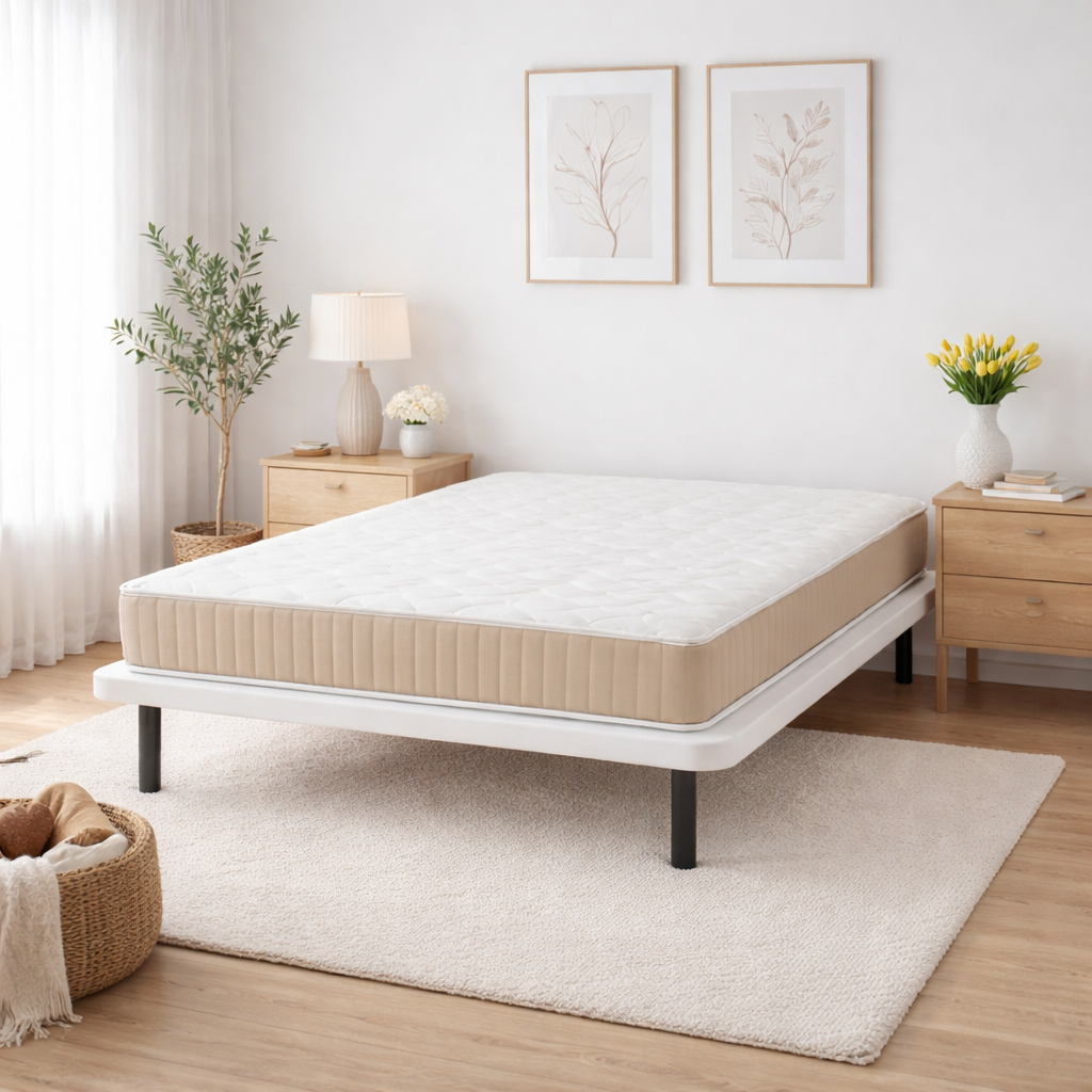 Experimente a combinação ideal de estabilidade e flexibilidade com o Tapi Kobe e o colchão de molas ensacadas Sora de 20 cm. Criada para oferecer um suporte corporal otimizado e respirabilidade, esta combinação garante uma noite de sono refrescante.