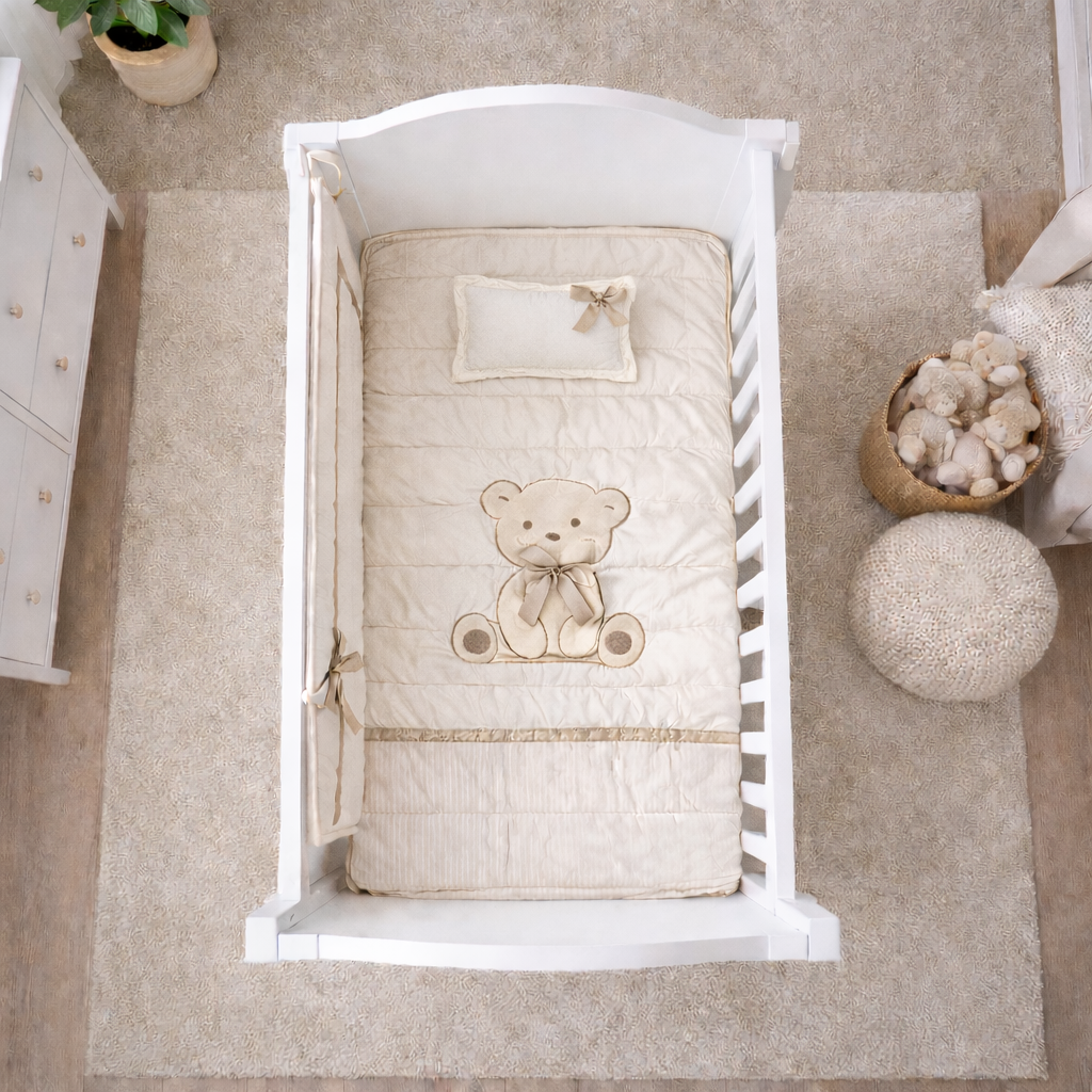 Um conjunto completo que combina suavidade e leveza, ideal para criar um berço acolhedor para o seu bebé. O edredão, o resguardo e a almofada garantem conforto e um toque suave em cada momento de descanso.