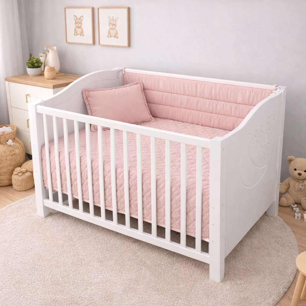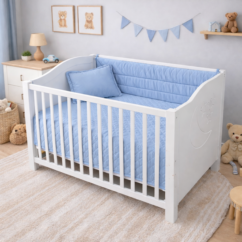 Conjunto prático para o descanso do bebé, composto por edredão, resguardo e almofada. Desenvolvido com materiais suaves e enchimento equilibrado, é uma solução funcional para o dia a dia.