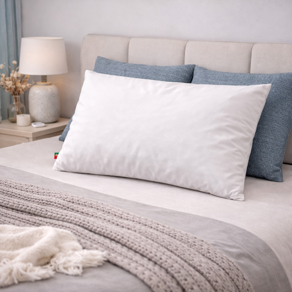Almofada com flocos de espuma, que permite uma circulação de ar equilibrada, ajudando a manter o conforto durante a noite.