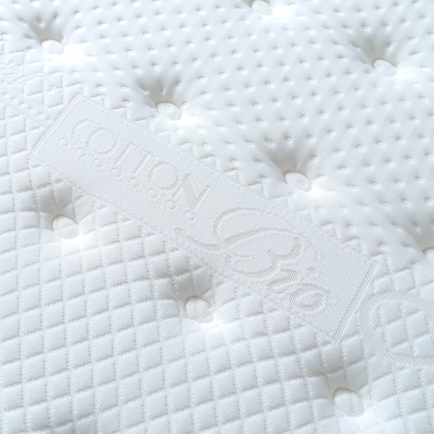 A parte superior apresenta um padrão requintado de pontos e losangos, que espelha a harmonia e a força da jade. Este design intricado flui como a espuma do mar, refletindo a adaptabilidade e o suporte fluidos do colchão. Confeccionado com algodão biológico para um toque suave e respirável, proporciona conforto enquanto respeita a natureza.