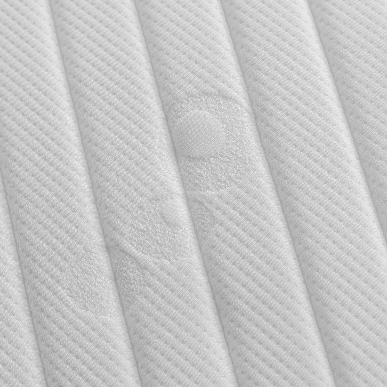A superfície superior dos nossos colchões para bebé foi cuidadosamente desenhada com padrões delicados em riscas, não apenas pela estética, mas para melhorar a circulação de ar e a respirabilidade. Estas suaves e discretas ondulações ajudam a regular a temperatura, mantendo o seu bebé fresco e confortável durante a noite. A textura suave proporciona um toque reconfortante, criando o ambiente ideal para um sono profundo e ininterrupto. Cada detalhe é pensado para apoiar o bem-estar do seu bebé, garantindo um descanso tão pacífico quanto restaurador.